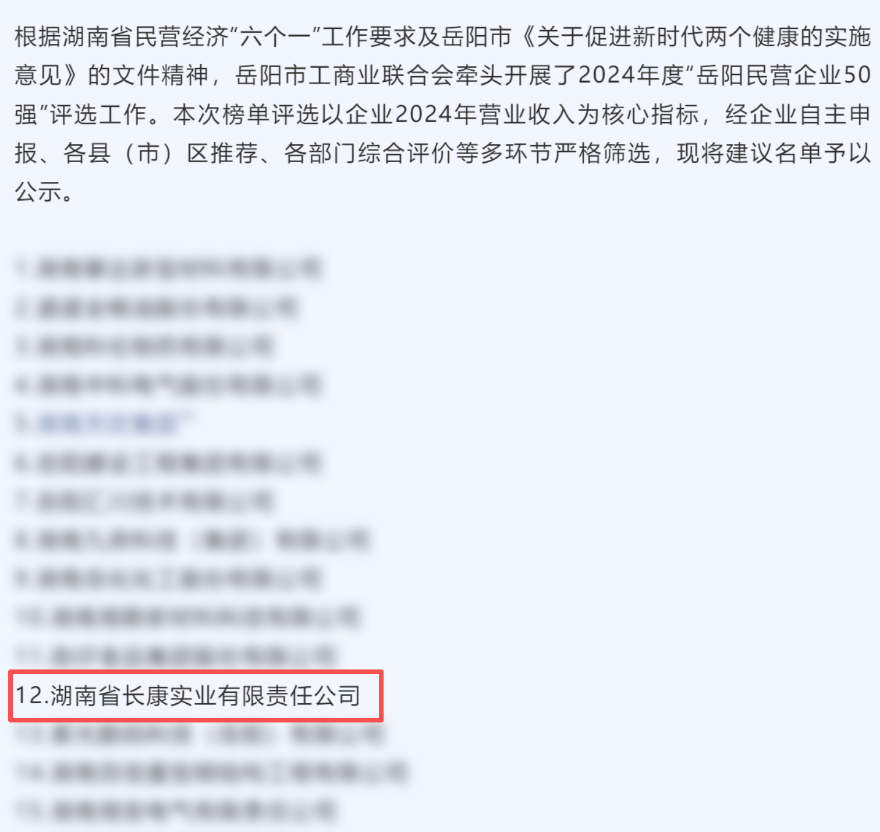 近日,岳陽市工商業(yè)聯(lián)合會發(fā)布《2024年度“岳陽民營企業(yè)50強”建議名單的公示》,湖南省長康實業(yè)有限責任公司赫然在列,用硬核實力斬獲這份城市級榮譽。
